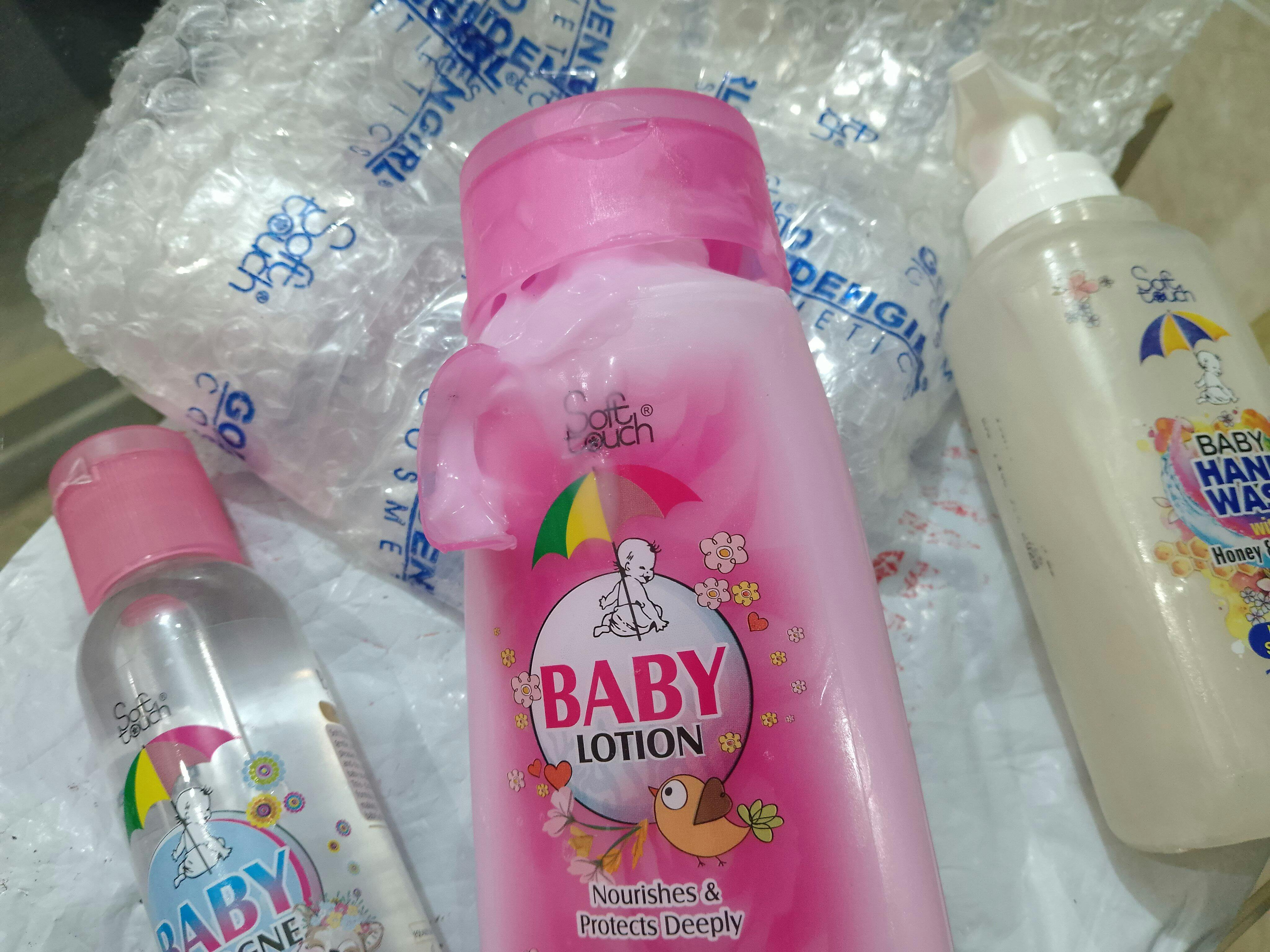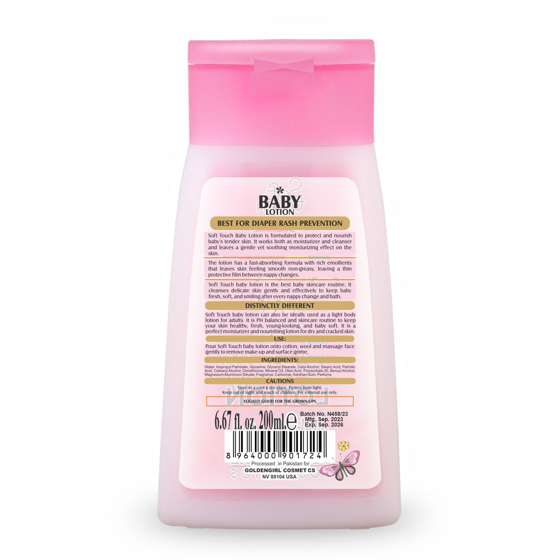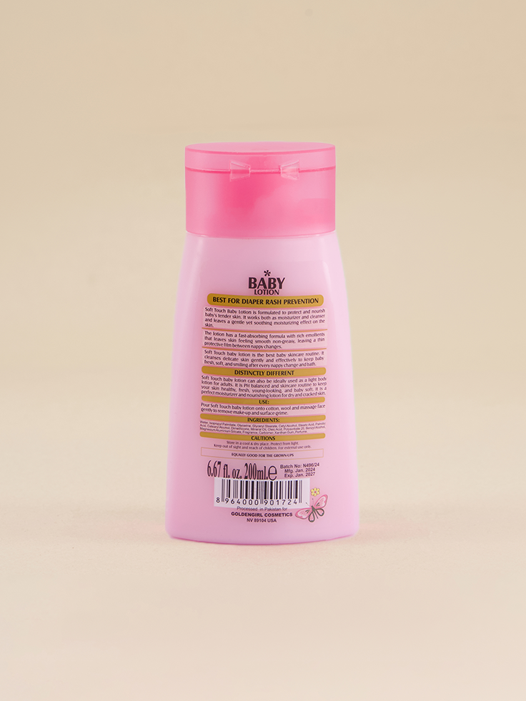 Soft Touch Baby Lotion is a specially formulated lotion to protect and nourish your baby”s tender skin. It works both as a moisturizer and cleanser and leaves a gentle yet soothing moisturizing effect on the skin.