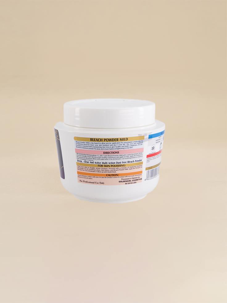 Golden Girl Bleach Powder is a newer way of bleaching the face and body. It must be mixed with Oxidizing Emulsion volume 20 for skin polishing, face, and body bleaching. The selection of the Oxidizing Emulsion is vital, the higher the volume, the more prompt and stronger bleach results will be. Bleach Powder is fine-grained and super air floated to give you maximum spread.