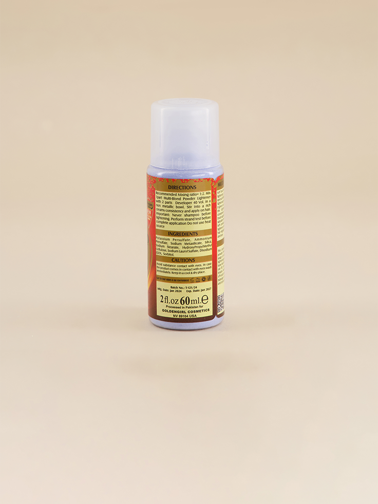 Bleach Powder Strong by Soft Touch Golden Girl is a newer method for streaking and highlighting hairs. It must always be mixed with Oxidizing Emulsion volume 40 to give you the superior action. The choice of the Oxidizing Emulsion is very important as the higher the volume, the stronger and quicker the streaks will be. Bleach Powder is fine-gained and super air floated to give you maximum spread.