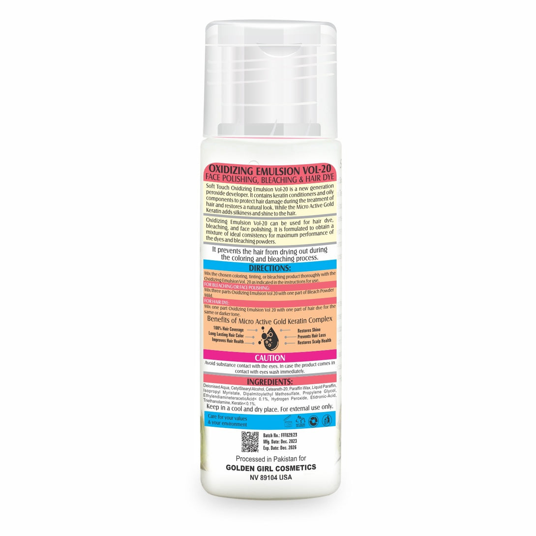Soft Touch Oxidizing Emulsion volume 20 can be used both for the skin and hair for hair dye, bleaching, and face polishing. It is formulated to obtain a mixture of ideal consistency for maximum performance of the dyes and bleaching powders.