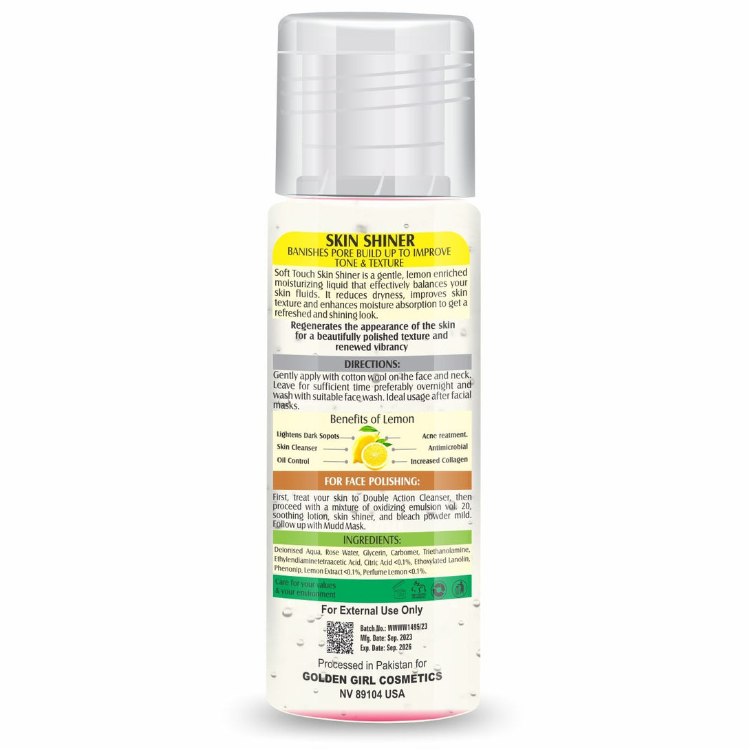 Soft Touch Skin Shiner is a gentle, lemon-enriched moisturizing liquid that helps refresh and hydrate the skin. It supports balanced moisture levels, reduces dryness, and promotes a smooth, naturally radiant appearance.