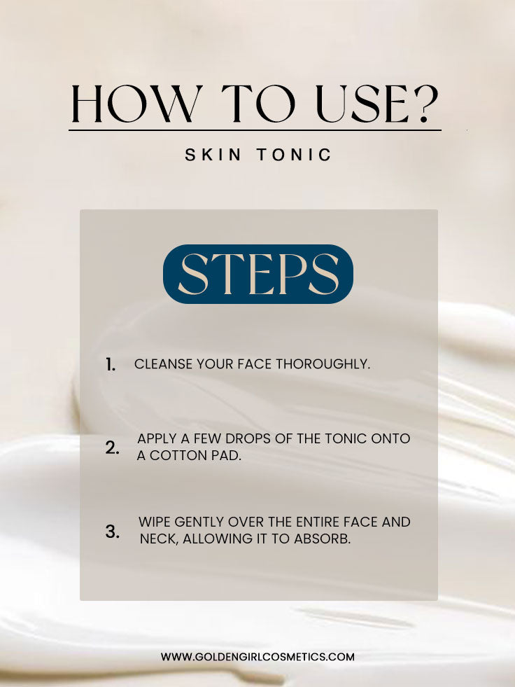 Apply skin tonic with a cotton pad to revitalize the skin process and to restore the natural PH. Apply soft-touch moisturizing lotion for better results.