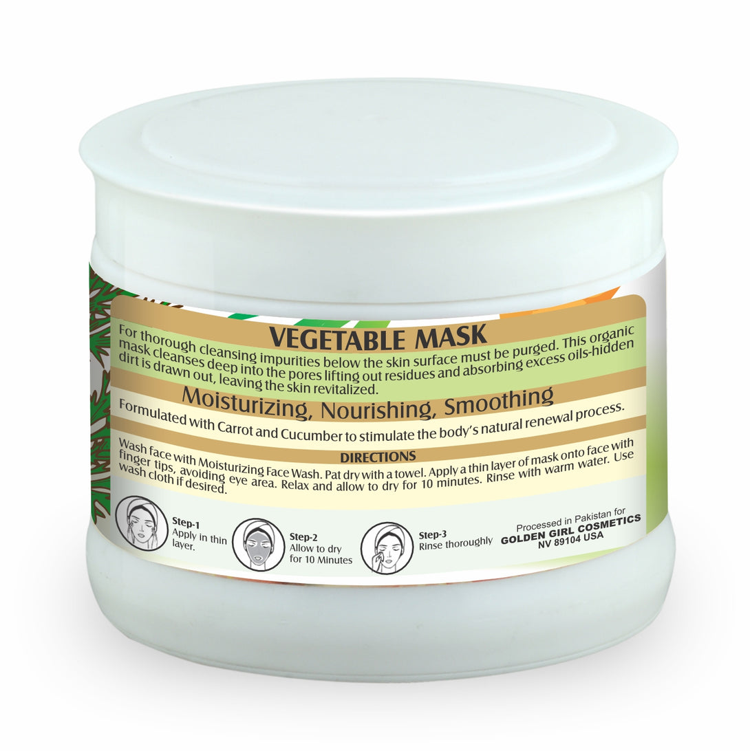 Vegetable Mask: For thorough cleansing impurities below the skin surface must be purged. This organic mask cleanses into the pores-lifting out residues and absorbing excess oil. Hidden dirt is drawn out, leaving the skin revitalized. Formulated with Carrot and Cucumber to stimulate the body's natural renewal process.
